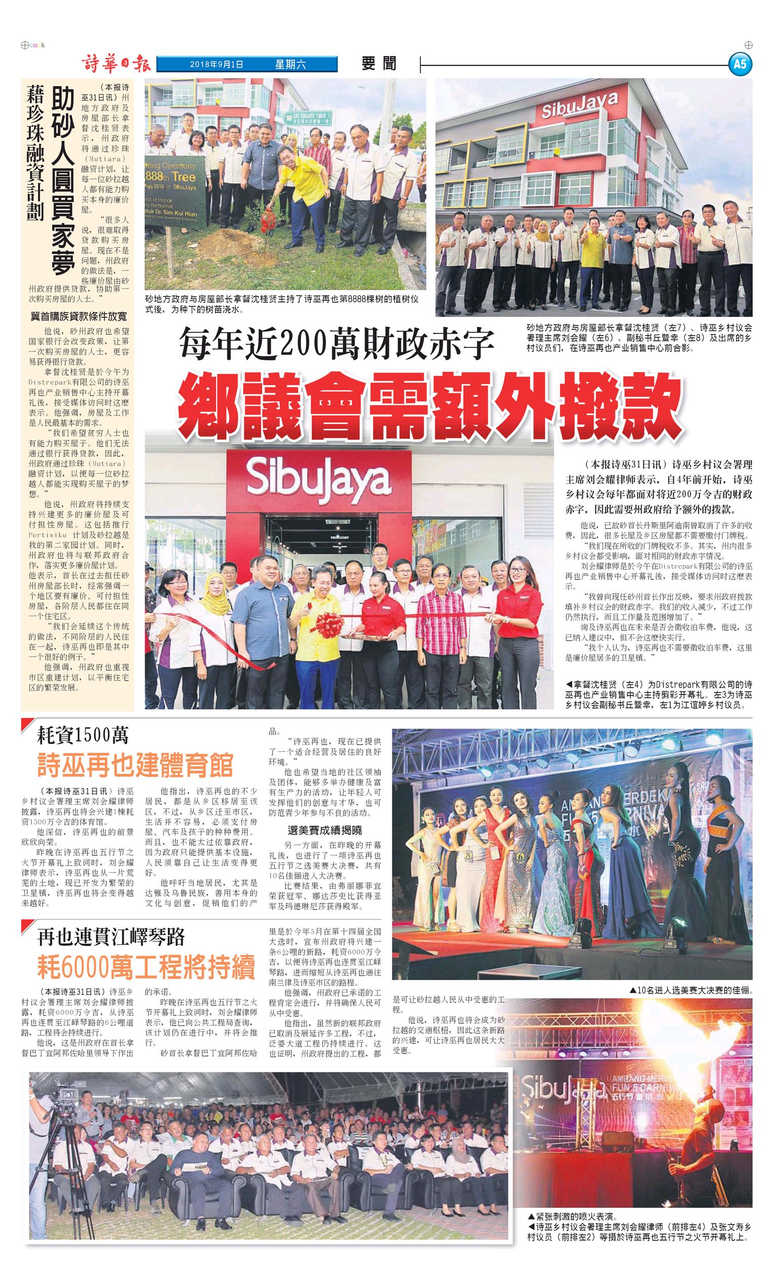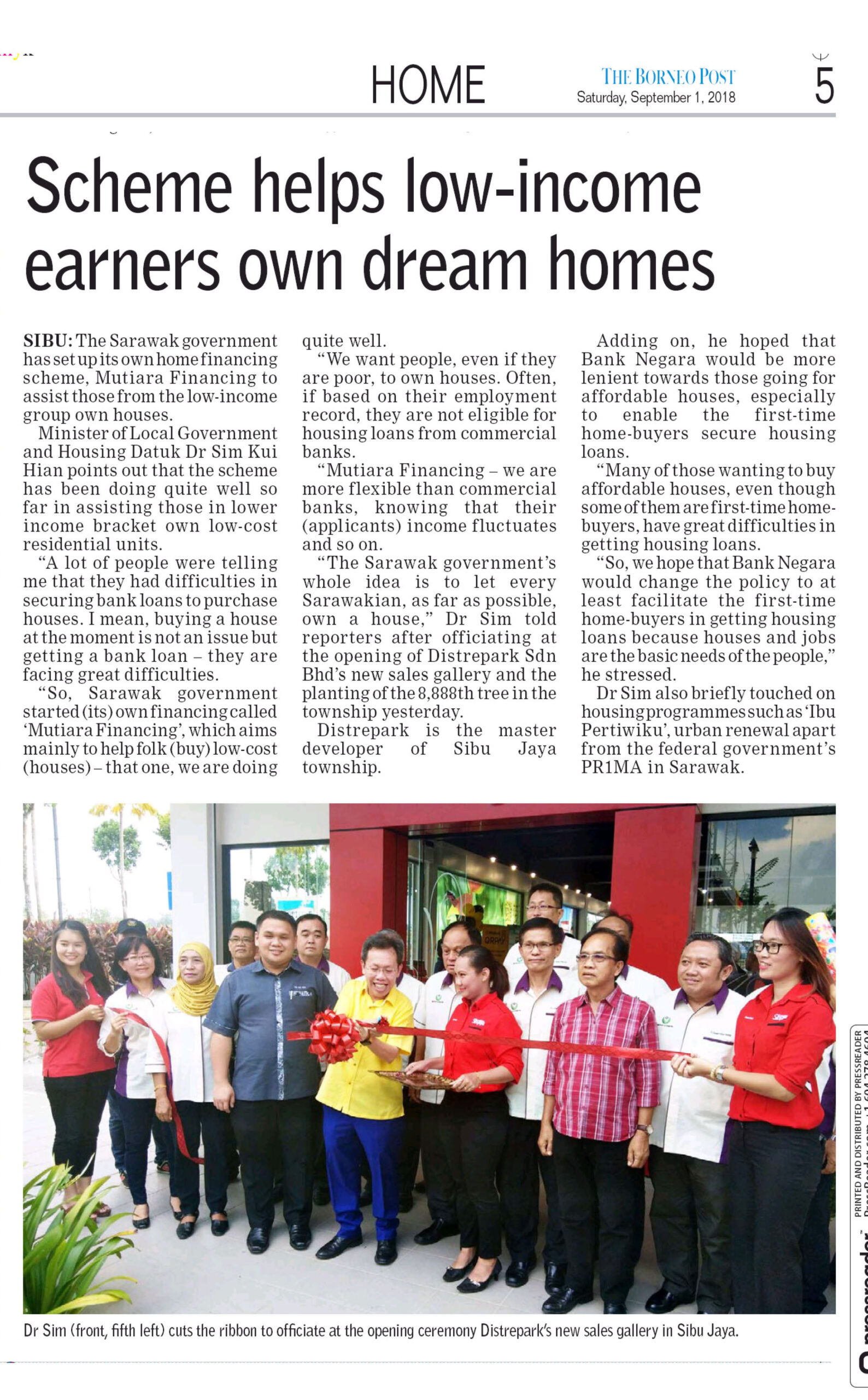 “I strongly support their (SRDC) proposal to have their own administrative building in their own ‘kawasan’. Various drawings have been shown; once they are done, submit them to the state (government) for funding. We need to look at the funding, but given that Sibu Jaya is situated at such an important location, with the (Sibu) Airport and Pan Borneo Highway nearby, I think we need to give them good administrative facilities so that they can truly build a community here that people in Sibu can be proud of – one (equipped with) facilities for recreational and religious use, for schools and also healthcare – all around here,” Dr Sim told reporters after officiating at the opening ceremony of Distrepark Sdn Bhd’s new sales gallery and also the planting of the 8,888th tree in this township.